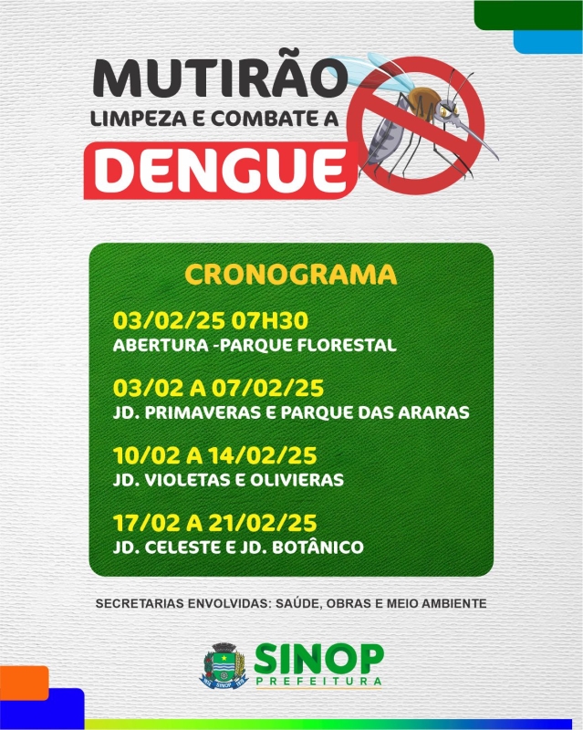 O lançamento oficial do mutirão será feito no Parque Florestal de Sinop, ás 7h30, com início, imediato, pelo jardim Primaveras e Parque das Araras. Na próxima semana [10 a 14/02], as equipes estarão no jardim Violetas e jardim das Oliveiras. Já, de 17 a 21 de fevereiro, estarão no jardim Celeste e jardim Botânico.